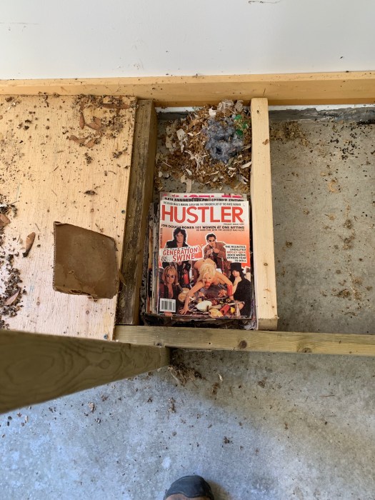 After a second, unplanned trip to the lumber store to get more wood and a couple new driver bits I tore the old shelving down. Once I got to the last shelf I made a discovery. Two discoveries actually.