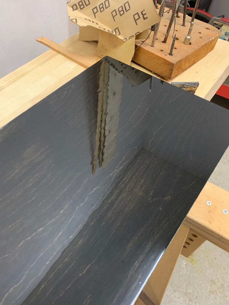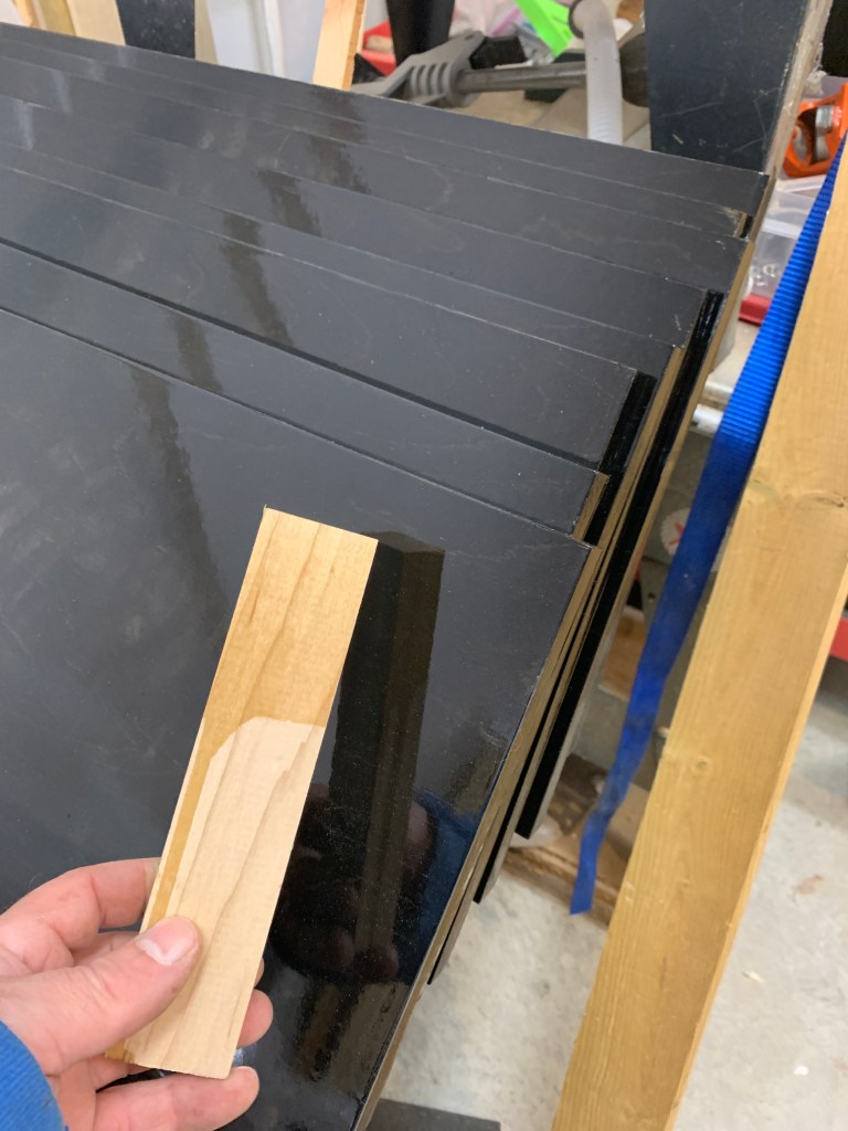 I can darn near shave using them. These are the shelves for the Cadovius unit. The ebony stain looks great. Not perfect but definitely suitable. Still humming and hawing about the finish for the mounting rails. We have done six different stains and an unstained-just-varnished test. Leaning to the unstained maple you see above.
